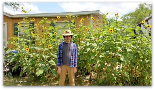 Here you are, dressed in clothes that are more than a tad too small, and a hat that is a challenge to stay on with all that poofy hair, in front of the crop of Sunflowers that have sprung up in the yard :)